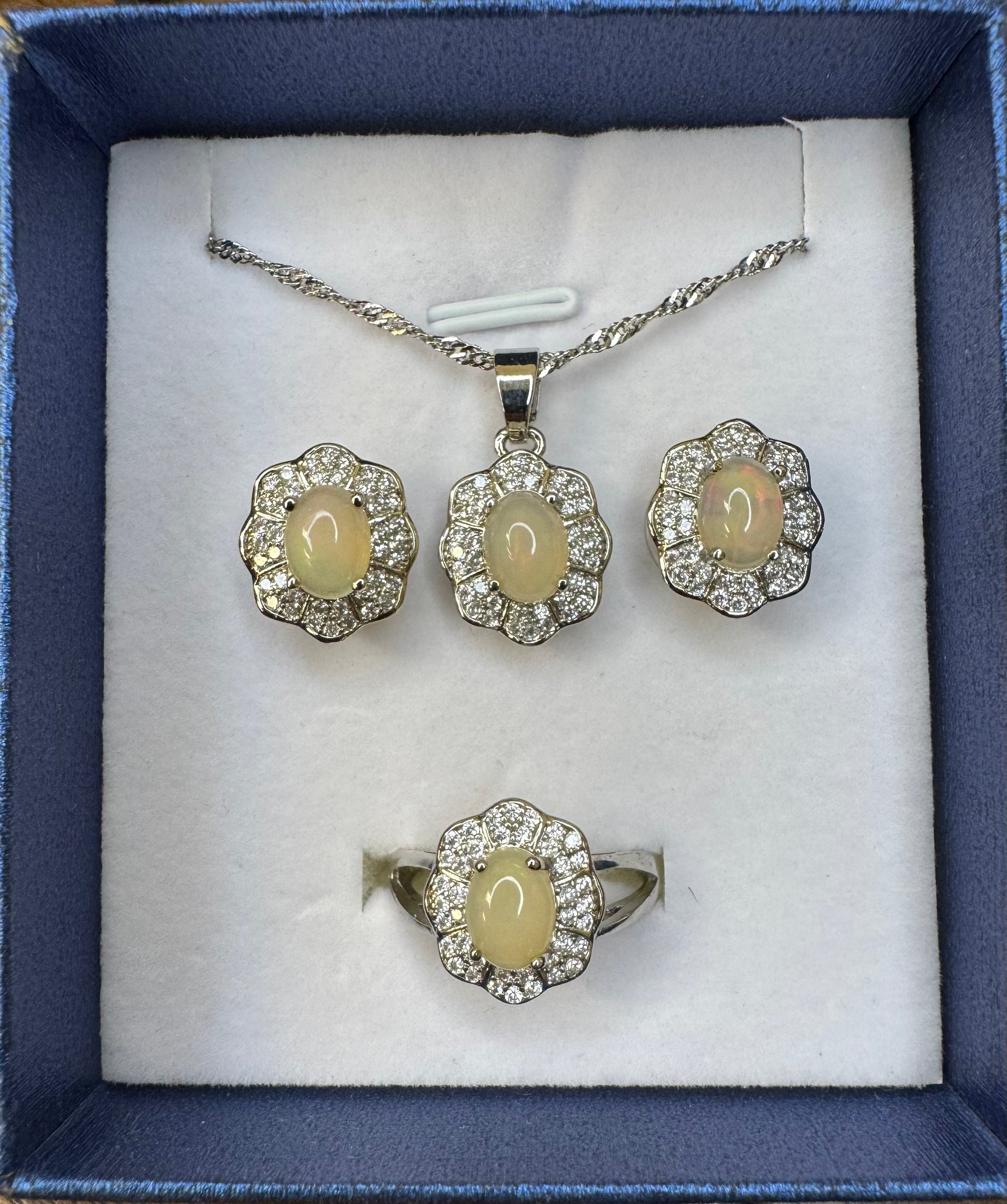 This 3-piece jewelry set features luminous opal stones set in high-quality 9.25 Sterling Silver, accented with small synthetic diamonds delicately arranged around each gemstone for added brilliance. The pendant comes with a 9.5-inch silver chain with a sturdy metal clasp, and the matching ring and earrings complete the set. Each piece is carefully crafted to showcase the opals’ soft, ethereal glow. Sourced from Burma, this set offers timeless elegance, perfect for gifting or special occasions.