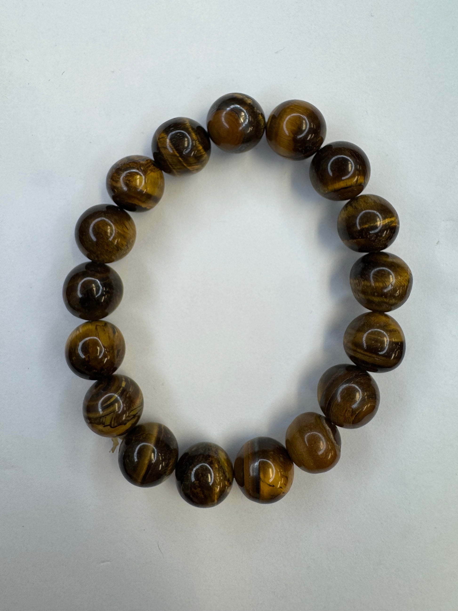 This striking bracelet features 12.5 mm round tiger eye beads in the classic golden-brown tones, strung on a durable stretch cord for a comfortable, flexible fit. The bracelet fits wrists up to 2.46 inches in diameter (approximately 7.7 inches / 19.5 cm), making it a bold and versatile accessory for everyday wear or a meaningful gift.