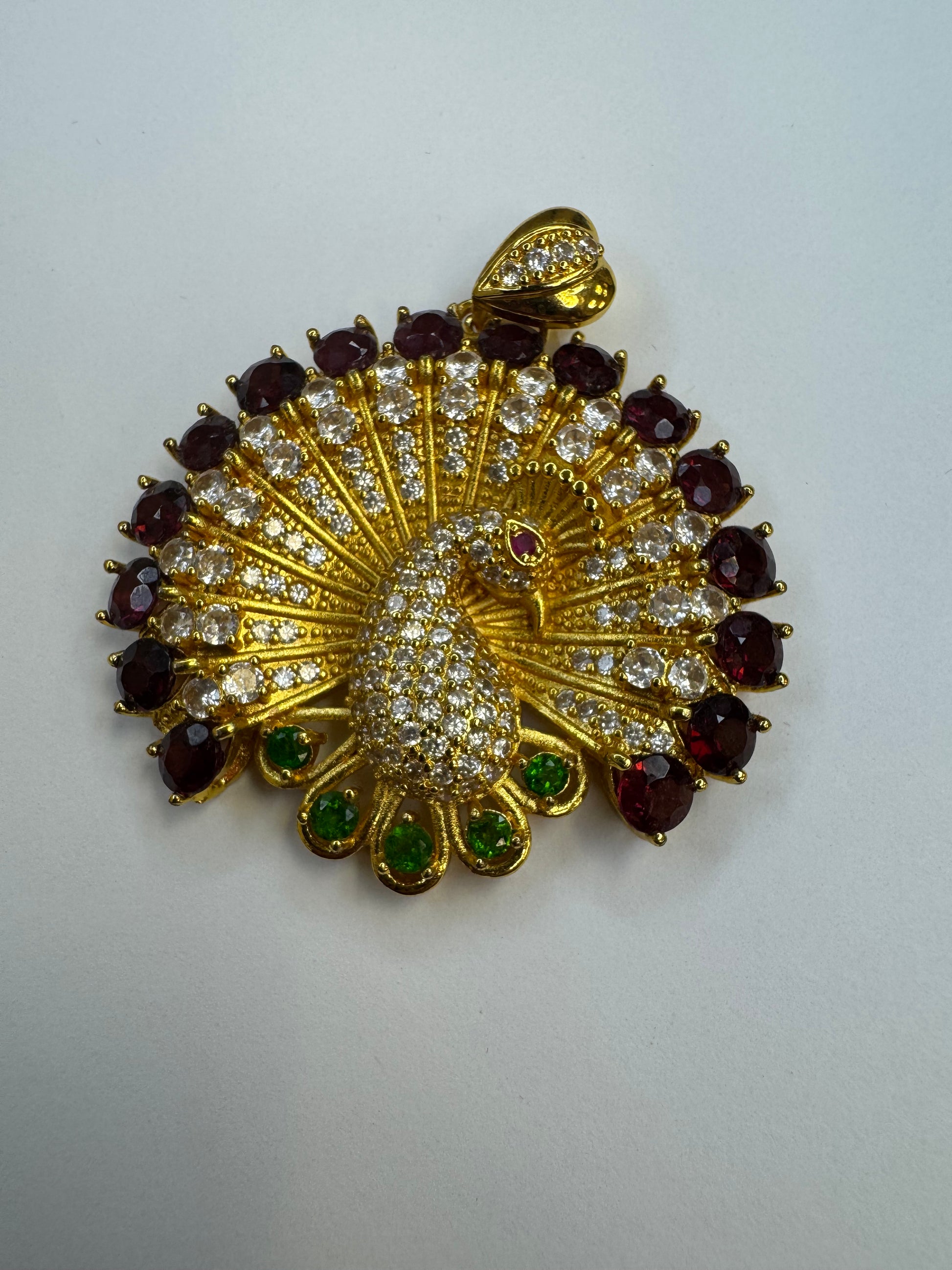 “Sovereign Garnet is an elegant peacock-inspired pendant featuring deep red garnets in the top feathers, accented by sparkling Korean synthetic diamonds. The peacock’s eye is highlighted with a ruby, while the chest and lower feathers are adorned with rich green garnets, creating a harmonious multicolored design. Crafted in sterling silver with 18k gold plating, this pendant offers a polished finish and lasting durability. The bail opening accommodates most standard chains, making it a striking statement piece for any outfit.”