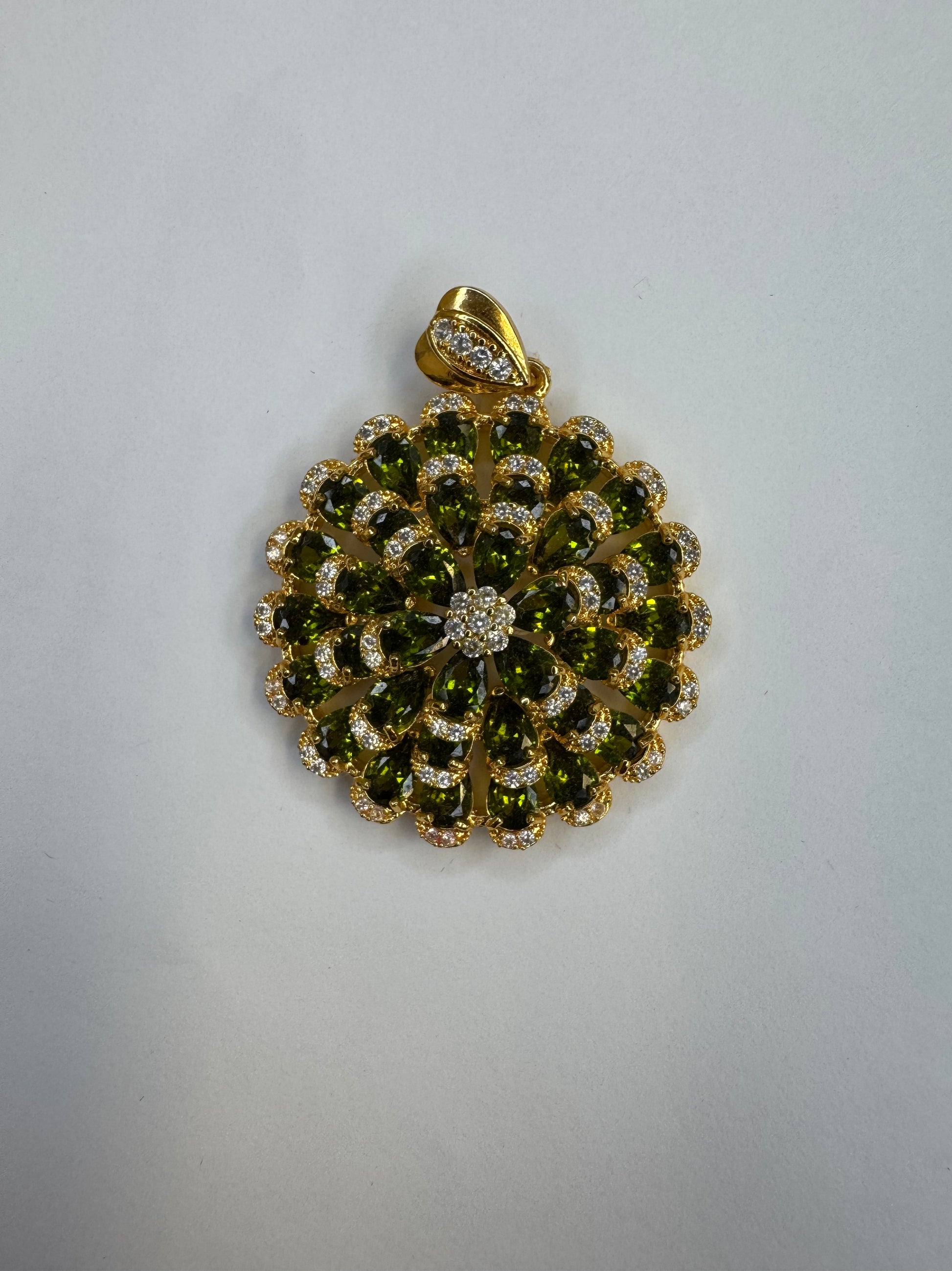 “Forest Bloom celebrates the vibrant beauty of nature. Adorned with green garnets and set in sterling silver with 18k gold plating, this flower-inspired pendant has a polished, durable finish. Measuring 54.5 mm in height, 44.5 mm in width, and 13 mm in depth, it’s an elegant piece that adds a fresh, natural touch to any outfit. The bail opening is approximately 8 mm, compatible with most chains.”