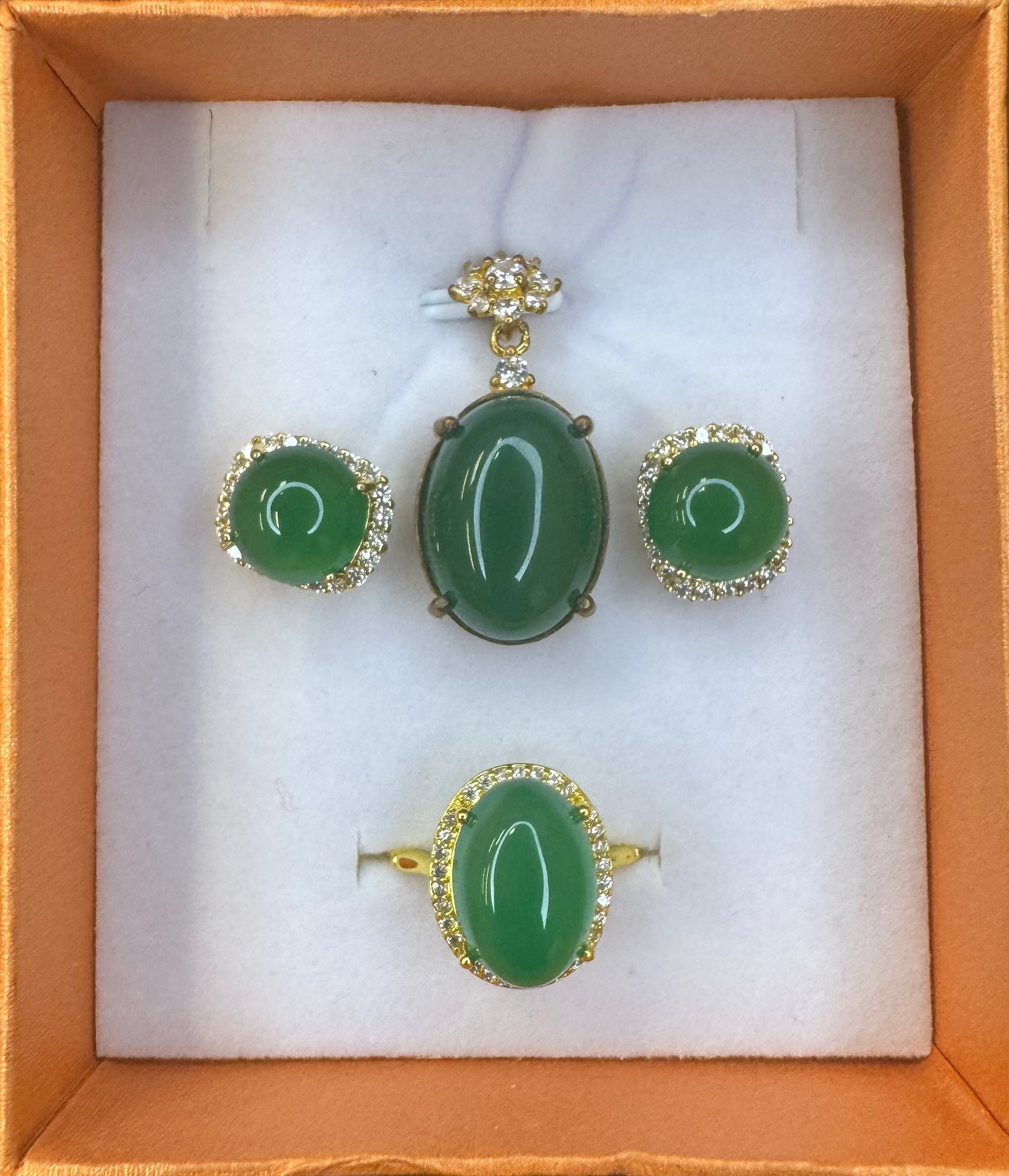 This 4-piece jewelry set features natural, vibrant green chalcedony stones set in high-quality 9.25 Sterling Silver with 18K gold plating, accented with small synthetic diamonds delicately arranged around each gemstone for added brilliance. The pendant includes a sturdy metal clasp, and the matching ring and earrings complete the set. Each piece is carefully crafted to showcase the chalcedony’s rich color and sparkle. Sourced from Burma, this set offers timeless elegance, perfect for gifting or special occasions.