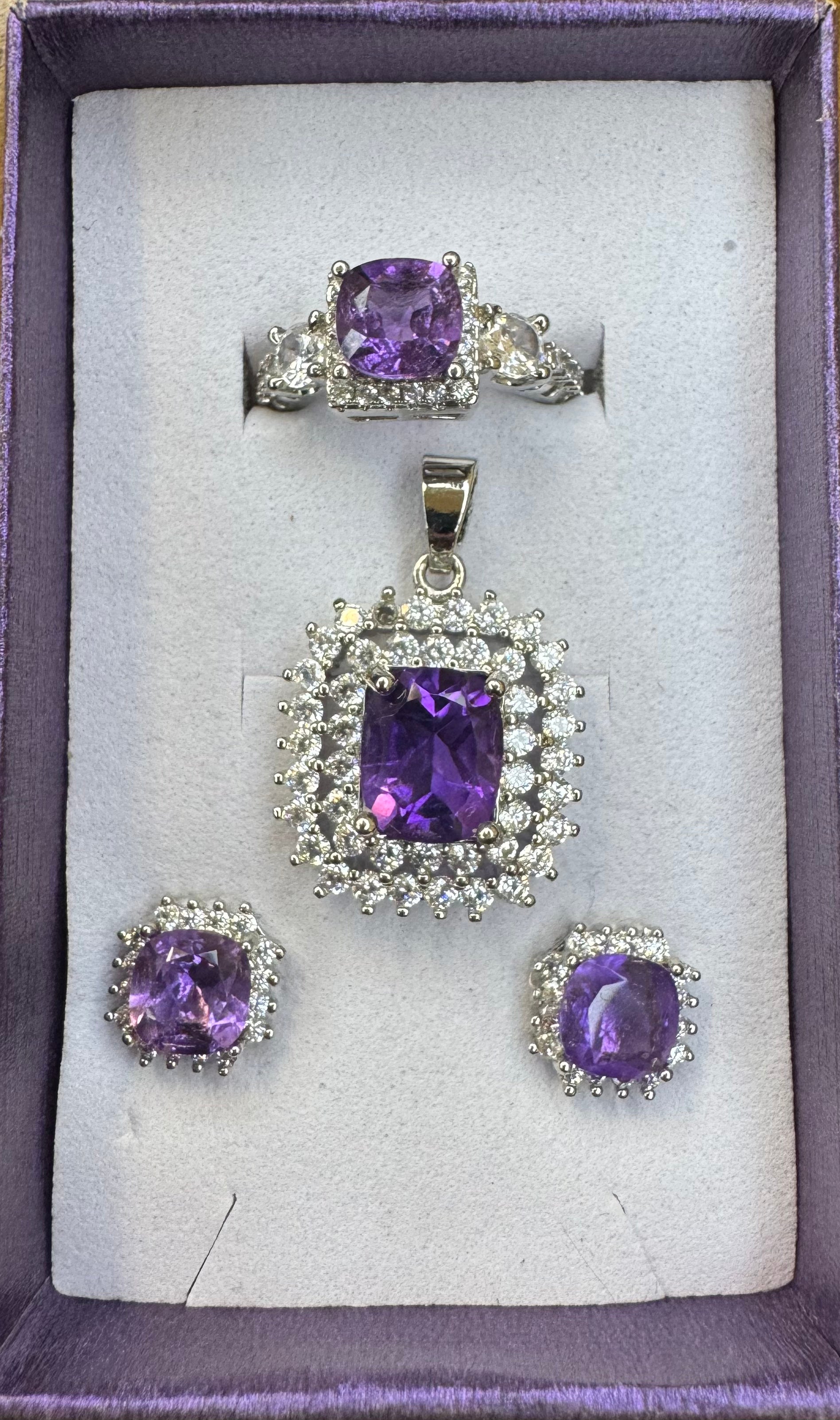 This 4-piece jewelry set features a luminous amethyst set in high-quality sterling silver, surrounded by delicate Korean synthetic diamonds that add subtle sparkle. The pendant is designed to be worn on a chain of your choice, and the matching ring and earrings complete the set. Each piece is carefully crafted to showcase the amethyst’s rich purple hue and the clean, square design, making it a timeless gift or a sophisticated addition to any jewelry collection.