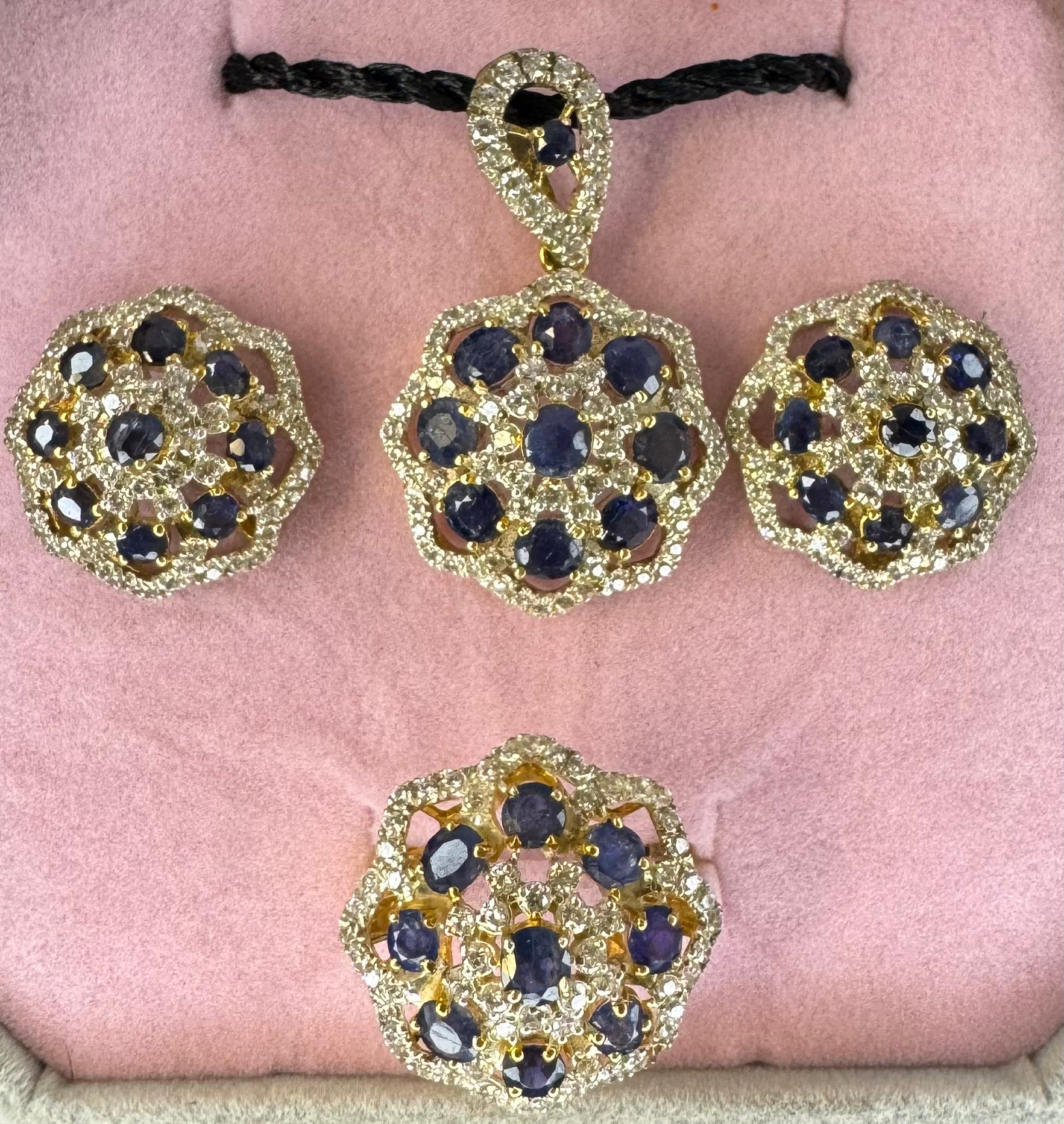 This 4-piece jewelry set features deep blue sapphires set in high-quality 9.25 Sterling Silver with 18K gold plating, accented with small Korean synthetic diamonds arranged around each gemstone for added brilliance. The pendant includes a sturdy metal clasp, and the matching ring and earrings complete the set. Each piece is carefully crafted to showcase the sapphires’ rich color and sparkle. Sourced from Burma, this set offers timeless elegance, perfect for gifting or special occasions.